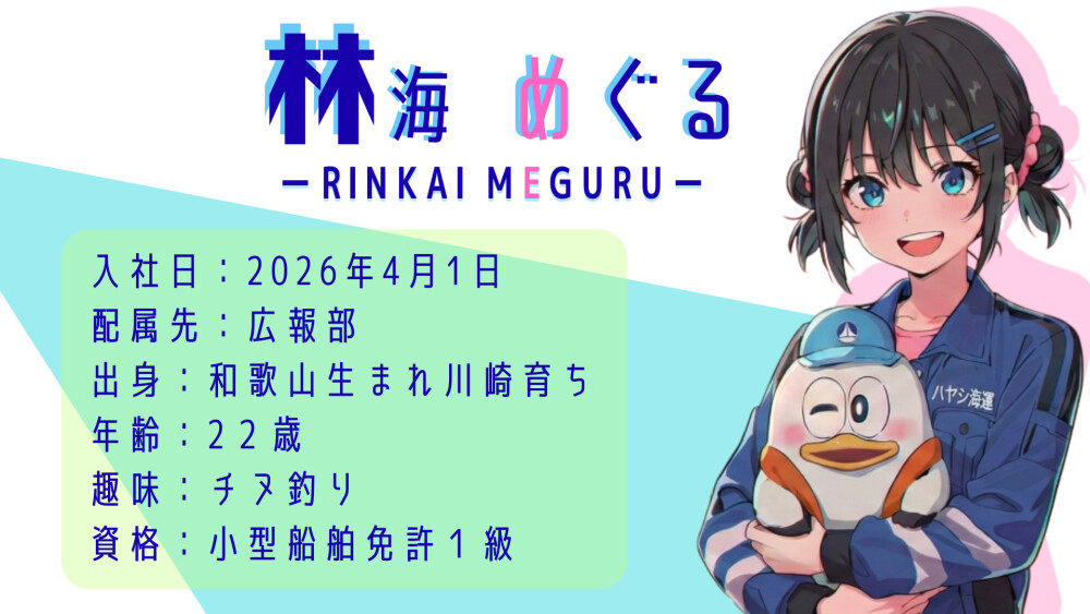 「めぐるちゃん」は、海とともに歩んできたハヤシ海運と人をつなぐ存在として、広報活動や各種発信を通じて登場してまいります。